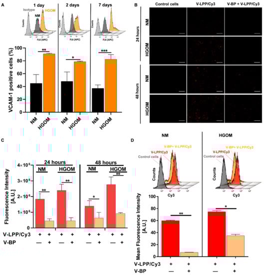 We have shown a specific intracellular uptake of VCAM-1 targeted lipopolyplexes by VIC grown in either NM or HGOM, mediated by the cell adhesion molecule VCAM-1, as demonstrated by the experiments done in the presence of an excess V-BP. The increased level of VCAM-1 expression on the surface of HGOM-exposed VIC led to a higher internalization of the fluorescently-labeled plasmid cargo encapsulated into VCAM-1 targeted lipopolyplexes compared to their internalization by VIC grown in NM. The data support and extend previous studies showing VCAM-1 as a suitable target for the specific binding and internalization of nanoparticles by the endothelial cells [