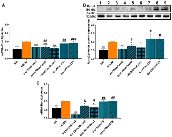 However, after the second transfection, a statistically significant difference in the reduction of Runx2 mRNA expression between targeted (V-LPP/Runx2) and non-targeted (Scr-LPP/shRunx2 and C60-PEI/shRunx2) formulations. was determined. Also, the Runx2 mRNA level is lower than that measured at seven days, after the first oVIC transfection with V-LPP/shRunx2, while, after cells transfection with Scr-LPP/shRunx2 and C60-PEI/shRunx2, the level of Runx2 mRNA was kept constant. A possible explanation of the reduced Runx2 mRNA expression obtained with targeted lipopolyplexes after the second transfection may be their higher cellular internalization, mainly by receptor-mediated endocytosis by clathrin-coated pits, as reported [