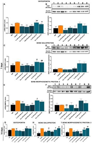 After exposure to HGOM medium for five days and after transfection with different lipopolyplexes (V-LPP/shRunx2, Scr-LPP/shRunx2, V-LPP/shCTR, and Scr-LPP/shCTR) and C60-PEI/shRunx2 polyplexes for 48 h, VIC were subjected to Western blot assay. The cells were washed with cold PBS and lysed in radio-immunoprecipitation assay (RIPA) buffer. The protein level in cell lysates was quantified by bicinchoninic acid assay following the manufacturer’s instructions (Sigma-Aldrich, Merck KgaA, Darmstadt, Germany). After quantifying the total protein concentration, 30 µg/lane of cell protein extracts were separated by 5–15% gradient SDS-PAGE gels. After transferring onto nitrocellulose membranes using a Trans-Blot Semi-Dry system, the blots were probed with the following appropriate primary antibodies: rabbit anti-Runx2 (1:200), rabbit anti-osteopontin (1:1000), goat anti-BSP (1:1000) and rabbit anti-BMP-2 (1:500). After washing, the blots were incubated with the appropriate secondary antibodies at RT for one hour. The membranes were, then, incubated with the chemiluminescent substrate and visualized with ImageQuant Las 4000. The densitometry of the bands was determined with ImageJ software developed at the National Institutes of Health (NIH, USA), and the results were normalized to β-actin, then calculated as fold change versus HGOM. The data were expressed as mean ± S.D. (standard deviation) of two experiments performed in duplicates.
