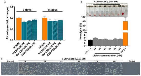 37]. This method measures the release of adenylate kinase (AK) from damaged cells in the culture medium. VIC were plated at a density of 50,000 cells/well in a 24-well plate and incubated with HGOM medium for 7 and 14 days, with a medium change every two days. On the 5th and 12th days, the cells were incubated with V-LPP/shCTR, Scr-LPP/shCTR, or with C60-PEI/shCTR polyplexes. At 48 h after incubation with lipopolyplexes and polyplexes (7th and 14th days in culture), the culture medium was collected for further determinations.