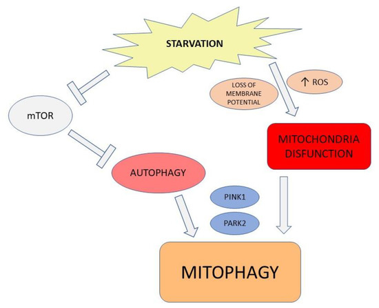 The metabolic activity of the cell counts the mammalian target of rapamycin complex 1 (mTORC1) as a modulator. The energetic plenty switches the metabolic behavior into anabolism, triggered by the mTORC1 complex, which phosphorylates ULK1 and ATG13. The phosphorylated ULK1 complex suppresses autophagic activity [12]. Moreover, autophagy controls mitochondria activity under stress conditions (Figure 1) as well. Dysfunctional mitochondria lose membrane potential, leading to the activation of PTEN-induced putative kinase 1 (PINK1). PINK1 activates the E3 ligase parkin (PARK2) to ubiquitylate mitochondrial outer membrane proteins, providing recognition signals to the autophagy machinery in order to dismantle them. The selective elimination of damaged mitochondria is a strategy to maintain a high mitochondrial quality associated with a decrease in metabolic stress and ROS production [13,14].