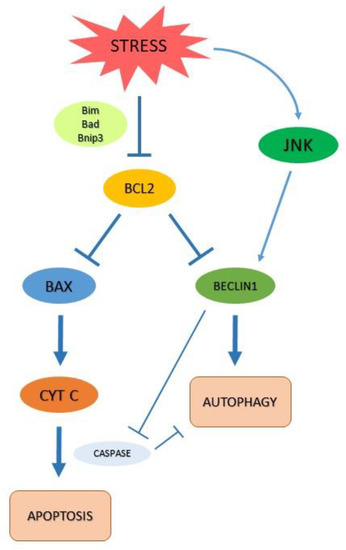 Notably, Beclin 1 is a BH3-only protein that is directly antagonized by the binding of Bcl-2/Bcl-xL. It has been shown that the endoplasmic reticulum pool of Bcl-2/Bcl-xL is responsible for the regulation of autophagy. This may suggest that the anti-autophagic and antiapoptotic effects of Bcl-2/Bcl-xL are regulated within the cell depending on their localization [18]. This evidence shows how autophagy is multi-faceted and closely connected to apoptosis, also considering the control exerted by apoptosis on autophagy or on their molecular intermediates, which both processes share as modulators [19]. Moreover, under certain cellular conditions, autophagy can promote cell death by either serving as an alternative cell death mechanism or enabling the induction of apoptosis. For example, mouse embryonic fibroblasts (MEFs) from Bax/Bak double-knockout mice fail to undergo apoptosis in response to the DNA-damaging agent etoposide. On the other hand, they are observed to induce massive autophagy followed by Atg gene-dependent cell death [20].