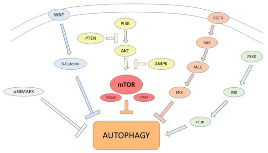 Main pathways involved in autophagy regulation. PTEN and AMPK downregulate the PI3K/AKT/mTOR signaling pathway, to enhance autophagy. mTOR suppresses autophagy acting via P70S6K and STAT 3 expression. The activation of the EGFR/Ras/MEK/ERK pathway, JNK/cJun, and p38MAPK signaling pathways promotes autophagy. The Wnt/β-catenin signaling pathway attenuates Beclin1-mediated autophagy.