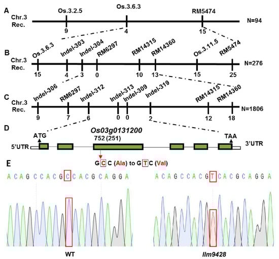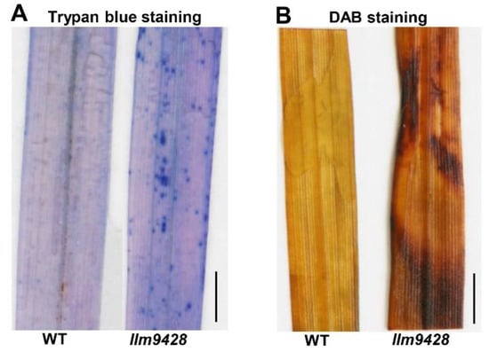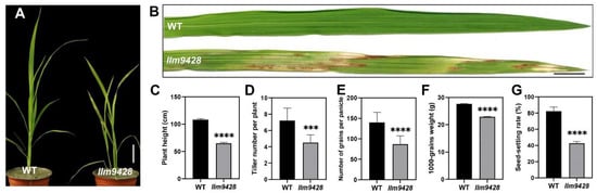 2.1. llm9428 Showed a Stable Phenotype of Lesion Mimic Mutant