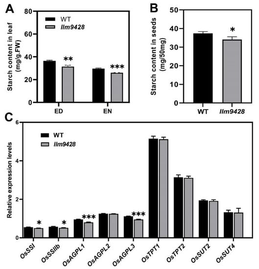 2.5. Reduction in Starch Content and Expression of Its Related Genes in llm9428