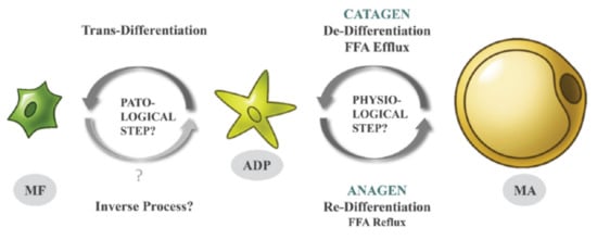 Recently, we demonstrated, in murine models, that these oscillations are the result of specific cellular conversions; mature dermal adipocytes de-differentiate in the catagen phase into the much smaller fibroblast-like adipocyte-derived preadipocytes (ADPs) and re-differentiate in anagen back into mature adipocytes (Figure 1) [3,4]. Such physiological processes of de- and re-differentiation of adipocytes repeat during every HF cycle and involve a large number of murine dermal adipocytes. The remaining mature adipocytes in the dWAT layer may be recruited from distinct adipose progenitors that were not subject to such previous cyclic conversions.