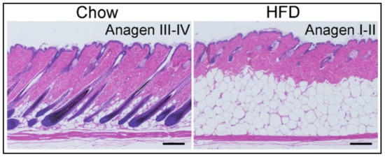 Taking into account the spatially limited distribution of psoriatic lesions and the modifications of dWAT located beneath these lesions [31,32], a critical question is what happens with dWAT during exposure to HFD? As we have demonstrated recently, HFD prompts at least two major modifications to dWAT: (1) a dramatic expansion of its volume involving both the processes of hyperplasia and hypertrophy of dermal adipocytes, and (2) a partial synchronization of HFs in the catagen/telogen phases with an impairment of their re-entry into anagen compared to chow-fed controls [4] (Figure 2). Both modifications effectively increase the number of spatially and temporally correlated de-differentiation and re-differentiation events that mature adipocytes undergo. Consequently, the relative levels of lipids in skin in the catagen stage of the HF cycle, as well as the production of the antibacterial cathelicidin protein in the anagen, differ. Of note, such dWAT modifications also modulate the mechanical properties of the skin.