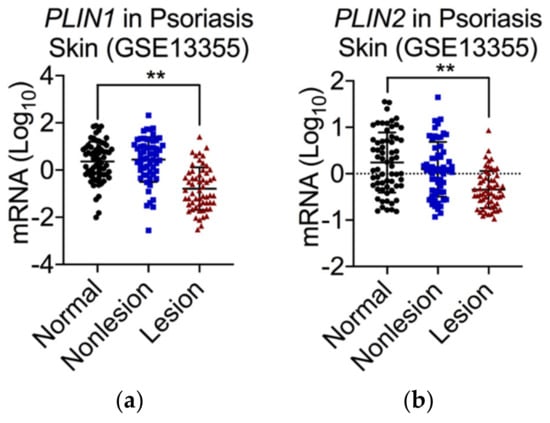 mRNA expression for PLIN1 (a) and PLIN2 (b) in psoriatic scales compared to normal and non-lesional skin. The materials and methods were described in [4], ** p < 0.01.