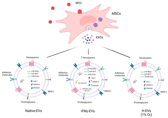 EVs encapsulate nucleic acids—mainly RNA—and proteins that are responsible for phenotypic changes in recipient cells. Several studies have demonstrated that the therapeutic and anti-inflammatory effect of MSC-EVs is due to their content. Interestingly, this content does not necessarily reflect the cytoplasm of the parental cells, but it is affected by environmental stimuli []. Recent findings have shown that preconditioning of MSCs with hypoxia [] or IFN-γ [,] influences the mRNA, miRNA, and protein cargoes of MSC-EVs by improving their immunomodulatory properties (Figure 1). Riazifar et al. [], in EXOs from BM- and UC-MSCs, identified a repertoire of anti-inflammatory mRNAs such as indoleamine 2,3- dioxygenase 1 (IDO-1), thymosin beta 10 pseudogene 1 (TMSB10P-1), and CD74 molecules—particularly overexpressed in EXOs from MSCs primed with IFN-γ (IFN-γ-EXOs) compared to EXOs from unprimed MSCs (Native-EXOs).