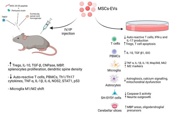 MSC-EVs’ in vivo and in vitro effects: Treatment with MSC-EVs showed their immunomodulatory, neuroprotective, and anti-inflammatory effects by enhancing Treg numbers and neurite outgrowth, and by diminishing pro-inflammatory cytokines (e.g., TNF-α, IL-1β) in favor of anti-inflammatory ones (e.g., IL-10, TGF-β), in EAE animal models (injecting MOG35–55 peptide/pertussis toxin, TMEV, or spinal cord homogenates) and in different cell cultures. Created with BioRender.com.