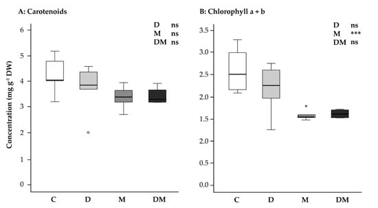 Effect of application of drought (D) and MeJA (M), separately and combined (D + M), on (A) carotenoids (β-carotene, lutein, violaxanthin, neoxanthin) and (B) chlorophyll a + chlorophyll b in Picea glauca needles at second sampling point. Results of a two-way ANOVA are shown at upper right. ns, not significant; ***, p < 0.001; white circles indicate outliers and asterisks indicate extreme values; C, control.