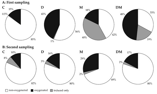 Effect of application of drought (D) and MeJA (M), drought + MeJA (DM), separately and combined (D + M), on the composition of monoterpenes of Picea glauca needles at first (A) and second (B) sampling points; C, control.