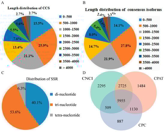 (A) Length distribution of circular consensus sequencing (CCS) reads, (B) length distribution of isoforms, (C) type distribution of simple sequence repeats (SSRs), and (D) Venn diagram of the predicted long non-coding RNAs (lncRNAs).