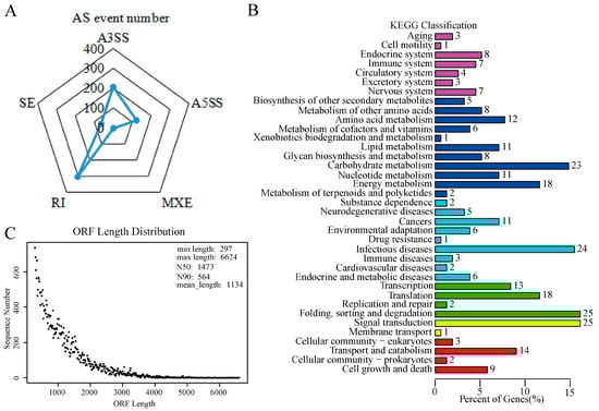 Alternative splicing (AS) identification and analysis, and open reading frame (ORF) prediction. (A) Statistics of the distinct AS events, (B) KEGG enrichment analysis of AS genes, and (C) length distribution of ORFs.