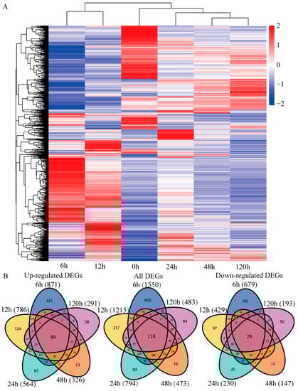 Overview of the differentially expressed genes (DEGs). (A) Clustering analysis and (B) Venn diagrams of DEGs.