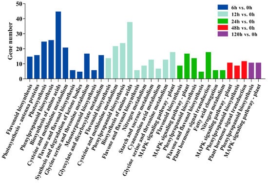 In GO enrichment analysis of all DEGs, 1607, 1604, and 1520 DEGs were enriched in the BP, MF, and CC categories, respectively (Figure S4). A total of 662 DEGs were mapped to 134 KEGG pathways, and the metabolic pathways regulated by PEG-induced drought stress were screened out (p < 0.05; Figure 4). Our results demonstrated that metabolic pathways related to drought stress were more significantly enriched in the early stages (6, 12, and 24 h) than in the late stages (48 and 120 h). The phenylpropanoid biosynthesis pathway was significantly enriched at all time points, and the MAPK signaling, flavonoid biosynthesis, and amino acid metabolism pathways were significantly enriched at most of the time points.