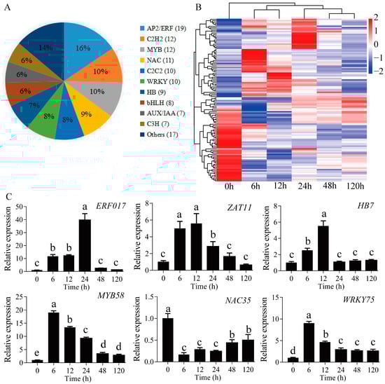 Transcription factor analysis. (A) Distribution of transcription factors sorted into different families, (B) clustering analysis of transcription factors, and (C) qRT-PCR of different transcription factors. Different lowercase letters indicate statistically significant differences at p < 0.05. The values are shown as the mean of three replicates ± SE (n = 3).