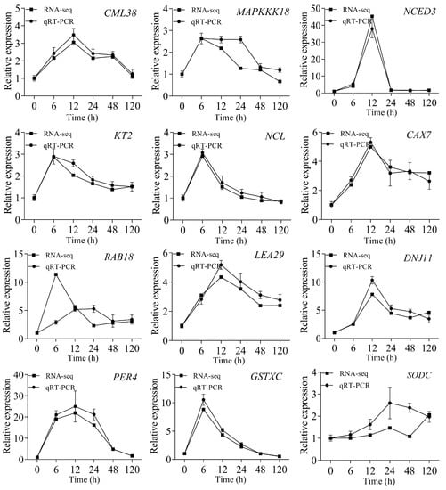 A total of 12 genes of differential expression were selected for validation of results of RNA-seq by qRT-PCR. These 12 DEGs were CML38 (f2p30_1011_11035), MAPKKK18 (f5p60_1300_26955), NCED3 (f2p21_2499_2742), KT2 (f7p60_2856_19557), NCL (f2p60_2293_3245), CAX7 (f3p60_1980_22126), RAB18 (f2p60_1369_7946), LEA29 (f2p37_1282_27056), DNJ11 (f2p60_820_32228), PER4 (f2p59_1311_26810), GSTXC (f2p60_894_312621), and SODC (f2p28_837_12827) homologous genes. The polyubiquitin 10 (UBQ10) gene was used as an internal control. The primers of the 12 DEGs are listed in Table S12. For accuracy, three technical replicates were used for each qRT-PCR reaction. The relative abundance of each transcript was determined using the 2−ΔΔCT method.