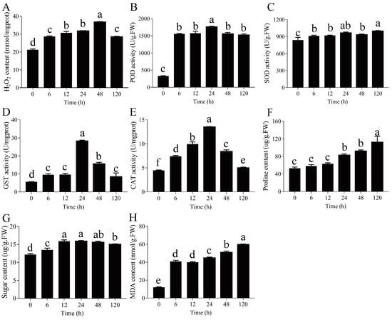 Effects of drought stress on the roots of Populus ussuriensis. (A) H2O2 content, (B) peroxidase (POD) activity, (C) superoxide dismutase (SOD) activity, (D) glutathione S-transferase (GST) activity, (E) catalase (CAT) activity, (F) proline content, (G) total soluble sugar content, and (H) malondialdehyde (MDA) content. Different lowercase letters indicate statistically significant differences at p < 0.05. The values are shown as the mean of three biological replicates ± SE (n = 3).
