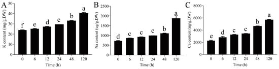 Measurement of mineral content. (A) K content, (B) Na content, and (C) Ca content. Different lowercase letters indicate statistically significant differences at p < 0.05. The values are shown as the mean of three biological replicates ± SE (n = 3).