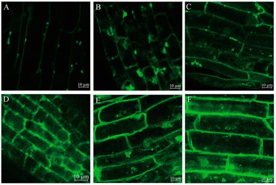 Confocal images of Fluo-4 AM (Biyuntian Biotechnology Co., Ltd., Shanghai, China) fluorescence showed an increase in the fluorescence intensity of meristematic cells in roots after PEG treatment, which suggested a higher free Ca2+ accumulation in PEG treatment groups (Figure 9A–F). In the control group, the Ca2+ accumulation in the root tip cells was mainly distributed on the cell wall and nucleus (Figure 9A). With the increase in time for PEG-induced drought stress treatment, the Ca2+ accumulation in the root tip cells gradually and evenly filled the cytoplasm.