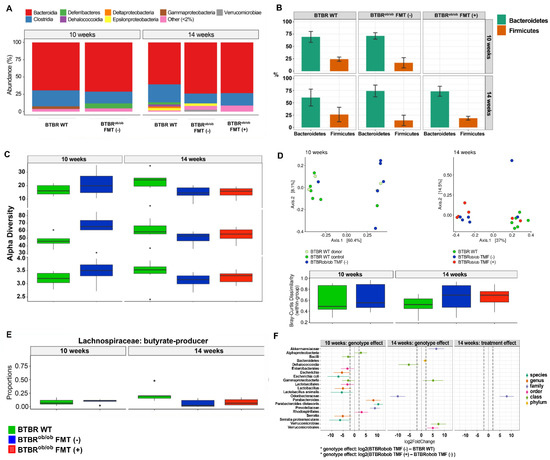 Intestinal composition analysis by 16S rRNA sequencing in BTBRob/ob FMT (+) and BTBRob/ob FMT (-) mice compared to BTBR WT mice. (A) Bacterial phyla according to 16S rRNA sequencing of 10- and 14-week-old BTBRob/ob FMT (+) and FMT (-) mice compared to age-matched BTBR WT mice: Bacteroidetes, Firmicutes, Proteobacteria, Actinobacteria, Verrucomicrobia, Deferribacteres, and Chloroflex. (B) Alpha diversity analysis by Shannon Index in 10-week-old BTBR WT and age-matched BTBRob/ob mice (p = 0.24), and among 14-week-old BTBR WT versus BTBRob/ob FMT (-) and BTBRob/ob FMT (+) mice (p = 0.21) indicated that the species richness was similar among groups. Results are median and IQR. (C) Principal coordinate analysis (PCoA) based on Bray–Curtis dissimilarity metrics did not show any clearly associated clusters in relation to the study animals. Results are median and IQR. (D) Butyrate producer Lachnospiraceae bacteria family proportions were similar between 10-week-old BTBR WT and age-matched BTBRob/ob mice (p = 0.59), yet higher proportions of these bacteria in 14-week-old BTBR WT compared to 14-week-old BTBRob/ob FMT (-) and FMT (+) mice (* p = 0.026) were observed. No significant difference was found between 14-week-old BTBRob/ob FMT (+) and FMT (-) mice (p = 0.39). Results are median and IQR. (E,F) Assessment of the differences in relative abundance between genotypes effect evaluated by log 2-fold change demonstrated greater relative abundance in the Gammaproteobacteria and Verrucomicrobiae classes and lower abundance in the Dehalococcoidia and Odoribacteraceae families in 14-week-old BTBRob/ob FMT (-) mice. The treatment increased the abundance of the Odoribacteraceae family in 14-week-old BTBRob/ob FMT (+) mice. In all analyses, n = 6/group.