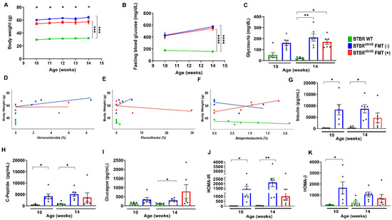 Glycosuria was higher in 14-week-old BTBRob/ob FMT (-) and FMT (+) mice when compared to age-matched BTBR WT mice and showed no difference due to treatment (p > 0.05) (Figure 2C). Body weight was positively correlated with the Verrucomicrobia phylum in 14-week-old BTBRob/ob FMT (-) mice (r = 0.9, * p = 0.02) (Figure 2D) and the Flavonifractor genus (r = 0.88, * p = 0.02) (Figure 2E) and Betaproteobacteria class (r = 0.93, ** p = 0.008) in BTBRob/ob FMT (+) mice (Figure 2F).