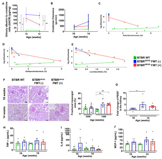 Functional and morphological evaluation of the kidney, metagenomics analysis, and systemic inflammatory markers. (A) Urinary albumin-to-creatinine ratio (UACR; μg/mg) was higher in 10-week-old BTBRob/ob mice when compared to the UACR of age-matched BTBR WT mice (** p= 0.006). UACR in 14-week-old BTBRob/ob FMT (-) mice was significantly more elevated when compared to age-matched BTBR WT mice (** p = 0.007). Additionally, UACR in 14-week-old BTBRob/ob FMT (+) mice was significantly lower when compared to BTBRob/ob FMT (-) mice (* p = 0.03), and no significant difference was found when compared to 14-week-old BTBR WT mice (p = 0.55). (B) Glomerular filtration rate in accordance with treatment and age: 14-week-old BTBR WT versus BTBRob/ob FMT (-) (p = 0.26), 14-week-old BTBR WT versus BTBRob/ob FMT (+) (p = 0.63), and BTBRob/ob FMT (-) versus FMT (+) mice (p= 0.78). (C,D) UACR of 14-week-old BTBRob/ob FMT (+) mice correlated negatively to the Odoribacteraceae family (r = −0.85; p = 0.034) and Deltaproteobacteria class (r = −0.85; p = 0.034). (E) UACR in 14-week-old BTBRob/ob FMT (-) and FMT (+) mice interacted negatively with the Lactobacillales order (r = −0.9; p = 0.02 and r = −0.89; p = 0.04 respectively). (F) Representative of periodic acid-Schiff (PAS) staining of kidney sections in BTBR WT, BTBRob/ob FMT (-), and FMT (+) mice between 10 and 14 weeks of age. 14-week-old BTBRob/ob FMT (-) and FMT (+) mice showed an increase in the accumulation of mesangial matrix when compared to age-matched BTBR WT mice (** p = 0.002 for both), and FMT did not prevent that structural damage in 14-week-old BTBRob/ob compared to untreated mice (p = 0.98). (G) Fold change of PDGF expression in the kidney in relation to age-matched BTBR WT: 10-week-old BTBRob/ob mice versus 14-week-old BTBRob/ob FMT (-) mice was significantly different (* p = 0.02), but no difference was found in 10-week-old BTBRob/ob mice versus 14-week-old BTBRob/ob FMT (+) mice (p = 0.05), and between 14-week-old BTBRob/ob FMT (-) and FMT (+) mice (p > 0.99). (H–J) Plasma evaluation of systemic inflammatory markers TNF-α (H), IL-6 (I), and MCP-1 (J) had no significant difference in accordance to the age and treatment (p > 0.99). All data are means ± SEM. Scale bars represent 20 µm in (F). In all analyses, n = 5–6/group.