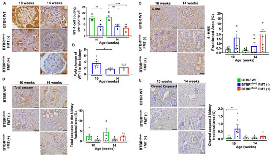 Immunohistochemical analysis of WT-1, total caspase, cleaved caspase-3, and 4-hydroxy-2-noneal (4-HNE) in the kidneys of BTBRob/ob FMT (-) and FMT (+) mice compared to BTBR WT mice. (A) BTBRob/ob mice exhibited lower detection of WT-1+ cells in all ages when compared to BTBR WT mice: 10-week-old BTBRob/ob and age-matched BTBR WT mice (** p = 0.004), 14-week-old BTBR WT versus 14-week-old BTBRob/ob FMT (-) (*** p = 0.0007) and FMT (+) (*** p = 0.0001) mice. FMT did not prevent a decrease in the podocyte number (p = 0.93). (B) Fold change of WT-1 expression in the kidney in relation to age-matched BTBR WT: 10-week-old BTBRob/ob mice versus 14-week-old BTBRob/ob FMT (-) mice was significantly different (* p = 0.03), but no difference was found in 10-week-old BTBRob/ob mice versus 14-week-old BTBRob/ob FMT (+) mice (p = 0.16), and between 14-week-old BTBRob/ob FMT (-) and FMT (+) mice (p = 0.62). (C) Immunohistochemical analysis for lipid-related oxidative stress was not significantly different between 10-week-old and BTBRob/ob and age-matched BTBR WT mice (p = 0.7), and 14-week-old BTBR WT versus 14-week-old BTBRob/ob FMT (-) mice (p = 0.89), 14-week-old BTBR WT versus 14-week-old BTBRob/ob FMT (+) mice (p = 0.1), and 14-week-old BTBRob/ob FMT (-) versus 14-week-old BTBRob/ob FMT (+) mice (p = 0.16). (D) Immunohistochemical analysis for total caspase showed no significant difference according to age and treatment: 10-week-old BTBRob/ob versus age-matched BTBR WT mice (p = 0.7), 14-week-old BTBR WT versus 14-week-old BTBRob/ob FMT (-) mice (p = 0.09), 14-week-old BTBR WT versus 14-week-old BTBRob/ob FMT (+) mice (p = 0.57), and 14-week-old BTBRob/ob FMT (-) versus 14-week-old BTBRob/ob FMT (+) mice (p = 0.85). (E) Immunohistochemical analysis for cleaved caspase-3 showed a significant difference between 10-week-old BTBRob/ob and age-matched BTBR WT mice (* p = 0.03), but no significant difference was found between 14-week-old BTBR WT versus 14-week-old BTBRob/ob FMT (-) mice (p > 0.99), 14-week-old BTBR WT versus 14-week-old BTBRob/ob FMT (+) mice (p = 0.99), and 14-week-old BTBRob/ob FMT (-) versus 14-week-old BTBRob/ob FMT (+) mice (p = 0.99). Scale bars represent 10 µm in (A) and 20 µm in (C–E). All data are means ± SEM. In all analyses, n = 5–6/group.