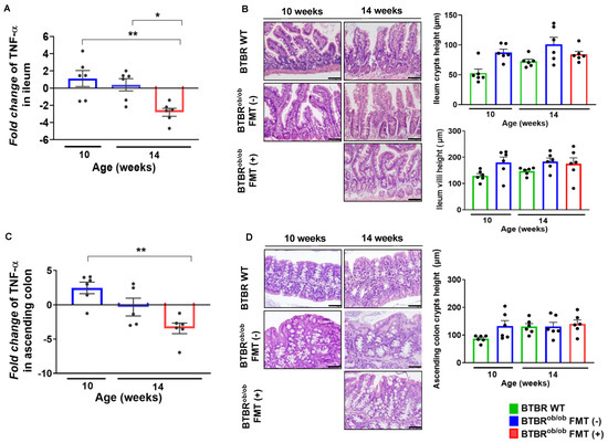 Evaluation of gene expression and morphological aspects of intestinal crypts and villi in BTBRob/ob FMT (-) and BTBRob/ob FMT (+) mice compared to BTBR WT mice. (A) Fold change of TNF-α expression in the ileum from age-matched BTBR WT: TNF-α expression of 14-week-old BTBRob/ob FMT (+) mice was significantly downregulated when compared to 10-week-old BTBRob/ob mice (** p = 0.004) and 14-week-old BTBRob/ob FMT (-) mice (* p = 0.02). No significant difference was found between 10-week-old BTBRob/ob versus 14-week-old BTBRob/ob FMT (-) mice (p = 0.76). (B) Representative hematoxylin-eosin (HE) staining of the morphological evaluation of ileum crypts from 10-week-old BTBRob/ob compared to age-matched BTBR WT showed no difference in crypt height (p = 0.08), also from 14-week-old BTBR WT versus 14-week-old BTBRob/ob FMT (-) (p = 0.49) and FMT (+) (p > 0.99) mice. No difference was observed between 14-week-old BTBRob/ob FMT (-) and FMT (+) mice (p > 0.99). Furthermore, no difference was found in the villi of this segment in 10-week-old BTBRob/ob mice and age-matched BTBR WT mice (p = 0.16), and between 14-week-old BTBR WT and 14-week-old BTBRob/ob mice FMT (-) (p > 0.99) and FMT (+) (p > 0.99) mice. No difference was observed between 14-week-old BTBRob/ob FMT (-) and FMT (+) mice (p = 0.99). (C) Fold change of TNF-α expression in the ascending colon relative to age-matched BTBR WT: TNF-α expression of 14-week-old BTBRob/ob FMT (+) mice was significantly downregulated when compared to 10-week-old BTBRob/ob mice (** p = 0.0014), but was not significantly different from 14-week-old BTBRob/ob FMT (-) mice (p = 0.1). (D) Representative hematoxylin-eosin (HE) staining from morphological assessment of ascending colon crypts in 10-week-old BTBRob/ob mice and age-matched BTBR WT and 14-week-old BTBR WT mice in comparison to BTBRob/ob FMT (-) and FMT (+) mice. The data showed no difference in the height of 10-week-old BTBRob/ob crypts when compared to age-matched BTBR WT (p = 0.18) mice and between 14-week-old BTBR WT and 14-week-old BTBRob/ob FMT (-) (p > 0.99) and FMT (+) (p = 0.99) mice. There was no difference between 14-week-old BTBRob/ob FMT (-) and FMT (+) mice (p = 0.99). All data are means ± SEM. Scale bars represent 50 µm in (B) and 20 µm in (D). In all analyses, n = 5–6/group.