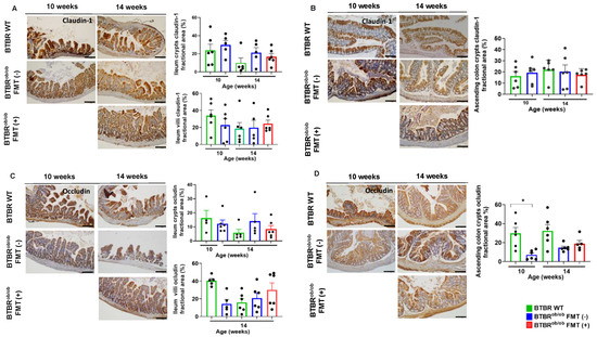 Immunohistochemical evaluation of claudin-1 and occludin proteins in ileum and ascending colon in BTBRob/ob FMT (+) and BTBRob/ob FMT (-) mice compared to BTBR WT mice. (A) Claudin-1 evaluation in the ileum crypts showed no significant difference according to age and treatment (all p > 0.99). Likewise, detection of claudin-1 in ileum villi was not statistically significant: 14-week-old BTBR WT versus 14-week-old BTBRob/ob FMT (-) (p > 0.99) and BTBRob/ob FMT (+) (p = 0.97) mice, and 14-week-old BTBRob/ob FMT (-) versus FMT (+) (p = 0.99) mice. (B) Claudin-1 expression in ascending colon crypts was not different among mice, regardless of age and treatment (all p > 0.99). (C) Occludin expression in ileum crypts was not significantly different between 14-week-old BTBR WT versus 14-week-old BTBRob/ob FMT (-) (p = 0.79) and FMT (+) (p > 0.99) mice, and 14-week-old BTBRob/ob FMT (-) versus FMT (+) (p > 0.99) mice. In ileum villi, occludin expression was not different between 14-week-old BTBR WT versus 14-week-old BTBRob/ob FMT(-) and FMT (+) (p > 0.99 for both) mice, and 14-week-old BTBRob/ob FMT(-) versus FMT (+) (p > 0.99) mice. (D) Occludin expression in the ascending colon crypt was significantly different between 10-week-old BTBRob/ob and age-matched BTBR WT mice (* p = 0.01), but not significantly different between 14-week-old BTBR WT versus 14-week-old BTBRob/ob FMT (-) (p = 0.06) and FMT (+) (p = 0.27) mice, and 14-week-old BTBRob/ob FMT (-) versus FMT (+) (p = 0.96) mice. All data are means ± SEM. Scale bars represent 100 µm in (A–D). All data are means ± SEM. In all analyses, n = 4–6/group.
