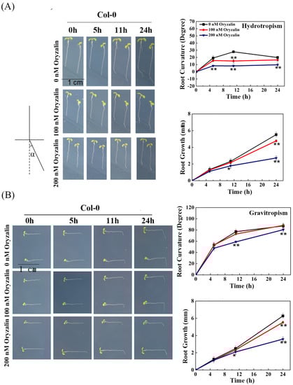 Oryzalin treatments decreased the root hydrotropic response of wild–type (WT) ecotype Col-0. (A) Root hydrotropic response and growth of ecotype WT in the absence or presence of 100 nM or 200 nM oryzalin (microtubule destabilizer: microtubule–disrupting chemical). Schematic representation of the root curvature angle (α) in the hydrotropism assay was indicated. (B) Root gravitropic response and growth of ecotype WT roots in the absence or presence of 100 nM or 200 nM oryzalin. Error bars indicate the SE; n ≥ 36. Asterisk indicates significant difference from the WT at * p < 0.05 or ** p < 0.01 (Student’s t-test).