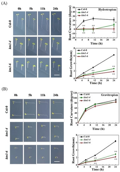 Since katanin, a microtubule severing enzyme, is known to play an important role as a catalyzer of tissue bending, we performed hydrotropic assays by using Arabidopsis KTN1 mutants ktn1-4 and ktn1-6, which exhibit compromised microtubule turnover [,], to examine if katanin-dependent microtubule organization is involved in root hydrotropism. The results showed that in the 5 days after germination (dag) ktn1-4 and ktn1-6 seedlings displayed significantly reduced root hydrotropic responses compared with that of WT (Figure 2A), but the root gravitropic curvatures in ktn1-4 and ktn1-6 seedlings were not significantly influenced (Figure 2B). The root growth of ktn1-4 and ktn1-6 seedlings is also much slower than that of WT (Figure 2A,B). These results suggested that microtubule dynamics is critical for hydrotropic responses but not for gravitropic responses in Arabidopsis roots.