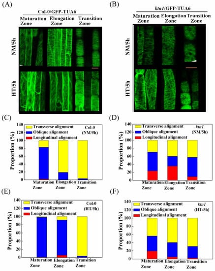 To understand how cortical microtubules are rearranged during root hydrotropic responses, we next analyzed cortical microtubule ordering in roots of WT and the ktn1 mutant. The transgenic Arabidopsis lines expressing α-tubulin 6 fused to green fluorescent protein driven by a 35S promoter in Col-0 (GFP-TUA6/Col-0) and ktn1 background (GFP-TUA6/ktn1) were used to visualize cortical microtubules by using confocal microscopy [,]. After hydrostimulation treatments, the cortical microtubules in the cells of the root elongation zone were rearranged from perpendicular arrays into an oblique orientation along the root growth axis, whereas the orientation of the cortical microtubule arrays in the root maturation and transition zones remained the same (Figure 3A,C,E and Figure S1A,B). On the contrary, cortical microtubules in the root cells of the ktn1 mutant consistently showed disordered organization before and after hydrostimulation and were even more transverse in the hydrotropism assay (Figure 3B,D,F). Taken together, with the reduced hydrotropic responses in the ktn1 mutant, these data suggest that cortical microtubule ordering is required for root hydrotropism.
