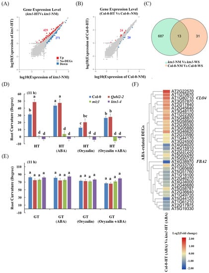 ABA enhances root curvatures of WT Col-0 and partially rescues the oryzalin-alterative root curvatures of WT but not miz1 and ktn1-4 mutants after hydrostimulation treatment. (A and B) Scatter plots of transcript abundance of ktn1 (A) and Col-0 (B) roots in the hydrotropism assay for two days. Red, blue, and gray dots represent upregulated, downregulated, and not differently expressed genes, respectively (probability ≥ 0.95 and log2Ratio ≥ 1). (C) Venn diagram showing the number of DEGs of ktn1 and Col-0 in the hydrotropism assay. (D) Measurements of root curvatures of ABA and oryzalin (a microtubule destabilizer) treatments on WT, Qabi2-2 (an ABA sensitive mutant), miz1 (a lost hydrotropism mutant), and ktn1-4 (a microtubule-associated protein (MAP) mutant) after hydrostimulation treatment (HT). (E) Measurements of root curvatures of ABA and oryzalin treatments on WT, Qabi2-2, miz1, and ktn1-4 mutants after gravistimulated treatment (GT). Error bars indicate SE; n = 36. Lower case letters show significant difference at p < 0.05 (Tukey’s test). (F) Heat map showing ABA-related differentially expressed genes (DEGs) in Col-0-HT (ABA) vs. ktn1-HT (ABA). Red = high transcript level; blue = low transcript level. The transcriptional profiles of ABA-related gene expression values (log2Ratio values) were analyzed by using the heat map command of the R language, which are displayed as colors ranging from red to blue as shown in the key.