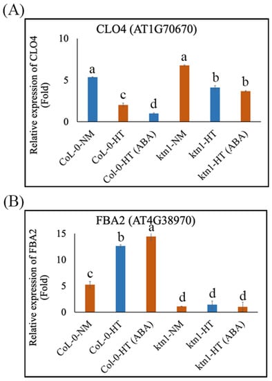 To confirm the roles of cortical microtubule arrays in regulating ABA signaling pathways during root hydrotropic responses, we performed high-throughput RNA sequencing by a BGISEQ platform by using Arabidopsis root tips (<5 mm from the root cap) of Col-0 WT and ktn1-4 mutant seedlings in the absence or presence of 1 μM ABA as materials, which produced more than 1.08 G clean reads mapped onto the Arabidopsis genome sequence, and at least 25,868 gene expressions were detected from root tips of the WT and ktn1-4 mutant. A total of 44 and 700 differentially expressed genes (DEGs) (probability ≥ 0.95) were found in roots of WT and the ktn1-4 mutant on the split agar-based hydrotropism assay, respectively (Figure 4A–C). Among these genes, 24 and 429 of DEGs displayed higher expressions, whereas 20 and 271 genes demonstrated lower expression in roots of WT and the ktn1-4 mutant under the hydrotropism assay, respectively (Figure 4A,B). A Venn diagram analysis of these DEGs exhibited 13 common DEGs between Col-0-NM (NM: normal medium) vs. Col-0-HT (HT: hydrostimulation treatment) and ktn1-NM vs. ktn1-HT (Figure 4C). In the presence of 1 μM ABA, the ABA-related DEGs between WT Col-0 and ktn1-4 root tips were observed after hydrostimulation treatment (Figure 4F). Among them, interestingly, the application of 1 μM ABA reduced the expression levels of the negative regulators (i.e., CLO4 (AT1G70670)) but enhanced the expression levels of the positive regulators (i.e., FBA2 (AT4G38970)) in the ABA signaling pathway in WT, compared with those of the ktn1-4 mutant in the hydrotropism assay (Figure 4F and Figure 5A,B), indicating that ABA treatment stimulated root hydrotropism through the ABA signal transduction pathway in WT but not the ktn1-4 mutant. On the one hand, the mRNA level of CLO4 (Caleosin 4) is downregulated in response to ABA and salt stress []. The clo4 mutants were more tolerant to drought than the wild type, whereas CLO4-overexpressing (Ox) lines showed hyposensitivity to those abiotic stresses []. On the other hand, the mRNA level of FBA2 (fructose 1,6-biphosphate aldolase 2) is upregulated following exposure to exogenous ABA, high salinity, and drought and may play key roles in ABA and stress signaling in plants []. Moreover, the Tyr phosphorylation level of FBA is modulated by ABA []. These results suggest that the lack of katanin might inhibit the gene expression of ABA-related signaling. Taken together, these data suggested that katanin-regulated microtubule ordering is essential for root hydrotropism and might work downstream of the ABA signaling pathway during root hydrotropic bending.