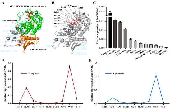 Protein catalytically active domain of BmChiNAG and expression patterns of BmChiNAG. (A) The predicted GH20 catalytic domain, additional GH20b domain, and conserved HMGGDEV×××CW motif in BmChiNAG. Based on the structure of O. furnacalis, Hex1 comparison domain model of BmChiNAG was constructed using SWISS-MODEL. (B) The protein catalytically active sites. CONSERVED Domain Architecture Retrieval Tool in NCBI was used to predict the protein catalytically active sites. (C) Expression pattern of BmChiNAG in different tissues of wild-type larvae on day three of fifth instar determined by real-time RT-PCR. The data are shown as mean ± SEM (n = 3). (D,E) Developmental pattern of expression of BmChiNAG in the wing disc and epidermis determined by real-time RT-PCR. The data are shown as mean ± SEM (n = 3). 4L1D, day one of fourth instar; 4L3D, day three of fourth instar; 4LM, molting phase in the fourth instar; 5L1D, the start of the fifth instar; 5L3D, day three of fifth instar; 5L7D, day seven of fifth instar; W1D, day one of the wandering stage; and P1, day one of pupa stage.