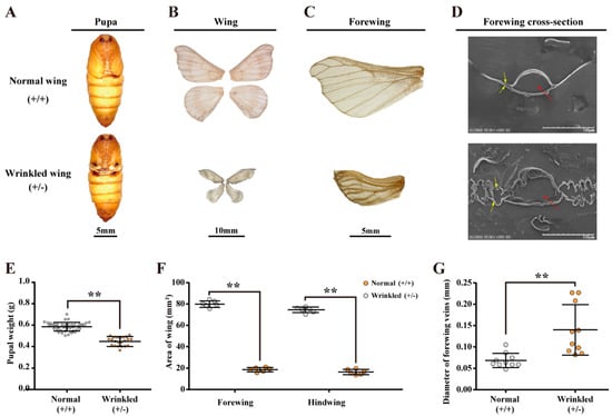 Phenotypic characterization in the wild-type and heterozygous mutant silkworm. The data are shown as mean ± SEM. Comparisons of target group were performed using Student’s t-test, ** p < 0.01. (A) BmChiNAG mutant heterozygous female pupa’s wing observation. (B,C) BmChiNAG mutant heterozygous female moth’s wing observation. (D) Morphological observation of control and BmChiNAG mutant heterozygous female moth forewing’s cross-section ultrastructure. The upper and lower wing membrane and the hollow tube-like wing vein are marked with yellow and red arrows, respectively. (E) Knockout of BmChiNAG affects the heterozygous pupa weight. The data are shown as mean ± SEM (n ≥ 20). (F) Area of forewing and hindwing between wing mutated heterozygous and wild-type. (G) Diameter of forewing veins between wing-mutated heterozygous and wild-type.