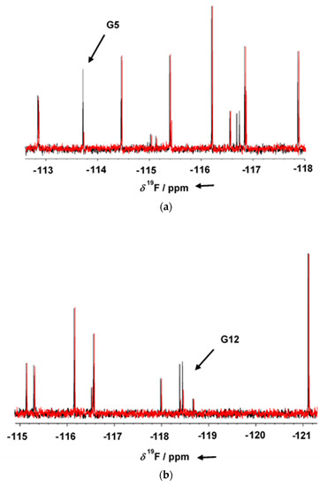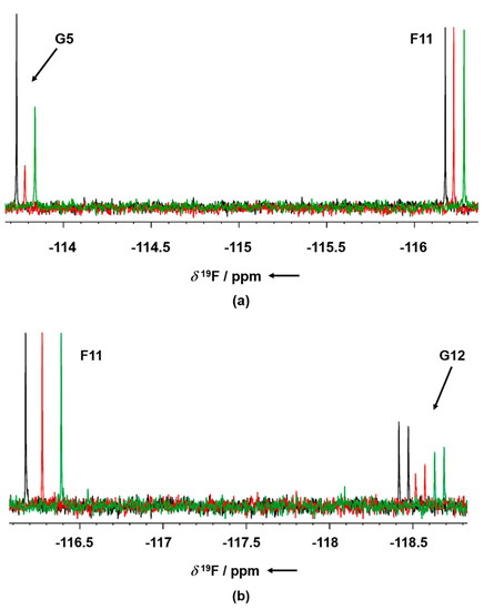 GSK-3β was pre-incubated at room temperature for 10 min in the presence of 1 mM AMP-PNP before addition to the mixtures. Binding compounds (hits) were identified in the NMR screening by comparing 19F cpmg NMR spectra of each mixture in the absence and in the presence of the protein as shown in Figure 1a,b (black and red traces, respectively). The NMR signals of the molecules interacting with the protein showed a line broadening on their NMR signals in the presence of the protein, resulting in a reduction in their intensities. On the contrary, NMR signals of the non-binding molecules were not affected by the presence of the target protein. Molecules selected from this first NMR screening were then tested as a single compound under the same screening conditions in the presence of two non-binding compounds as negative controls. The promising compounds, still showing binding to GSK-3β when tested as singles, were retested also in the presence of 3 mM AMP-PNP (among these, G5 and G12, whose NMR spectra are reported in Figure 2a,b, respectively). Finally, 32 compounds still showed binding to GSK-3β also in the presence of higher AMP-PNP concentration. These hits were then further analyzed and characterized through different biophysical approaches.