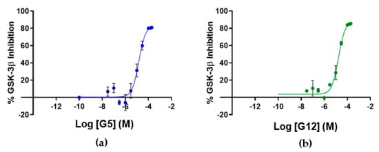Dose-response curves for GSK-3β inhibition by G5 (a) and G12 (b). Error bars denote SD.