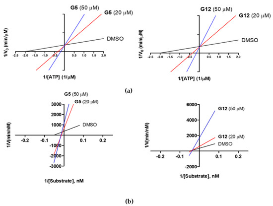 Lineweaver-Burk plots of GSK-3β kinetic data at two concentrations of G5 and G12 (20 and 50 μM). (a) Linear regression plotting of 1/V against 1/[ATP] at a given concentration of the compound. Intersecting at the same point on the y-axis indicates competitive inhibition with respect to ATP; (b) Linear regression plotting of 1/V against 1/[Substrate] at a given concentration of the compound. Intersecting at the same point on the x-axis indicates noncompetitive inhibition (G12), while for G5 the x intercept shifts right, suggesting a mixed inhibition with respect to the substrate.