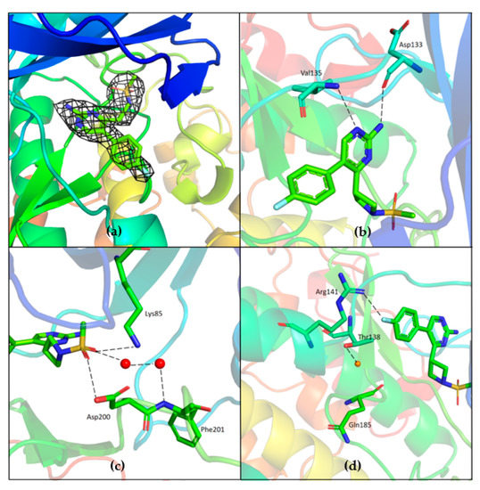 (a) Electron density corresponding to G5 contoured at 1.2 sigma; (b) Direct hydrogen bonding interaction between the core pyrimidine 2-amine of G5 with the backbone oxygen of Asp133 and nitrogen of Val135; (c) Hydrogen bonding interactions of methyl sulfonyl group of G5 with Lys85 and Asp200. Water (red spheres) mediated hydrogen binding network is also observed; (d) Conserved water (red sphere) is observed hydrogen-bonded to Thr138. Fluorine of fluoro-phenyl is hydrogen-bonded to Arg141; PDB 7U31.