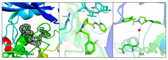 The binding position of G12 in the ATP pocket completely differs from the one of G5. Electron density corresponding to G12 is reported in Figure 8. Direct hydrogen bonding interactions are observed between pyridine nitrogen and carboxamide nitrogen with the backbone atoms of Tyr134 and Val135, respectively (Figure 8b). The propanoyl oxygen of G12 is involved in a hydrogen bonding interaction with Arg141 (Figure 8b). Electron density corresponding to the fluoro-phenyl group is not very well defined, suggesting that this portion of the G12 molecule is lacking adequate stabilizing interactions with the protein. A water-mediated hydrogen bond network is observed between the carboxamide oxygen of G12 and the backbone oxygen of Gln185 (Figure 8c). A similar interaction has been already observed and proposed to justify the specificity of ruthenium based inhibitors against GSK-3β [24].