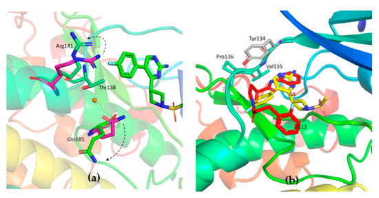 (a) In GSK-3β-G5 crystal complex (green), residues Arg141 and Gln185 are flipped away from the binding pocket in comparison to PDB 1Q4L (purple); (b) Overlapped structures of G12 (red) and G5 (yellow).