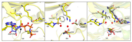 (a) Overlapped structure of GSK3β-G5 complex with GSK3β-AMP complex (PDB 1PYX); the black arrow indicates the first phosphate of AMP-PNP (b) Overlapped structure of GSK3β-G5 with CDK9 structure (PDB 3BLQ); (c) Overlapped structure of GSK3β-G5 with kinases showing inhibition with G5 (P70S6K/PDB 3A61, SAPK2a/PDB 1OZ1 and LOK1/PDB 6HXF). GSK3β-G5 complex is in yellow and comparison structures are represented in grey.