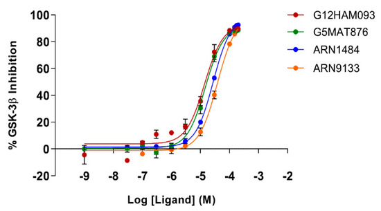Since the activity of GSK-3β is slightly higher than its normal activity under pathological conditions, a moderate inhibition has been recognized as the best approach to inhibit GSK-3β correcting aberrant kinase behavior and preserving its participation in the non-pathological pathways [36,37].
