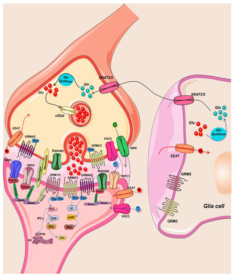 Schematic drawing of the glutamatergic synaptic pathway altered in ASD. Once released, glutamate can bind to and activate AMPA, Kainate, and NMDA ionotropic receptors or G-protein coupled metabotropic receptors on postsynaptic or presynaptic neurons as well as glial cells. Glutamate, taken up into glial cells by EAAT1/2 glutamate transporters, is converted into glutamine, which can be transported into glutamatergic neurons by SNAT3/5 transporters.