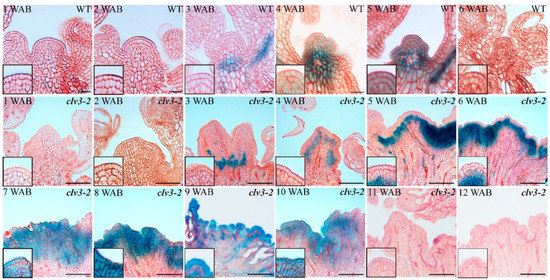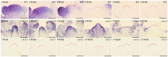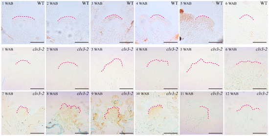 Through NBT (4-nitro blue tetrazolium chloride) staining, we examined the distribution and accumulation characteristics of in the IM domains of the WT and the clv3-2 mutant. In WT, displayed a strong signal in the IM domain, especially in the stem cell layers, at 1 WAB and 2 WAB. At 3 WAB, the level of in the stem cells was clearly decreased in the IM (pink dashed lines) but became undetectable from 4 WAB to 6 WAB (Figure 1). In the clv3-2 mutant, was detected for 2 weeks longer than in the WT (from 1 WAB to 5 WAB). Clear signals were obviously displayed in the clv3-2 IM domain from 1 WAB to 4 WAB. At 5 WAB, the level of in the stem cell layers was reduced and fully disappeared from the stem cells from 6 WAB (Figure 1).