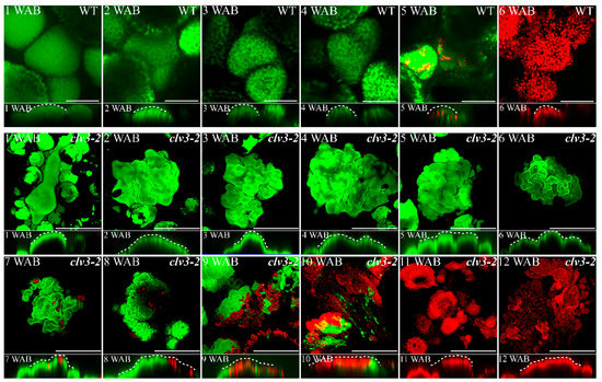 Whereas the stem cell death process has been studied by fluorescein diacetate (FDA) and propidium iodide (PI) staining and the key dPCD marker gene BIFUNCTIONAL NUCLEASE1 (BFN1) in WT Arabidopsis [2], similar studies in clv3-2 stem cells are still lacking. Thus, we examined the details of stem cell death in both WT and clv3-2 mutants in this study. The FDA/PI staining results showed that stem cell death started at 7 WAB in clv3-2 IM, and strong PI signals could be detected up to 10 WAB. Subsequently, all stem cells were stained by PI at 11 WAB and 12 WAB, as the entire clv3-2 IM was completely dead (Figure 3 and Figure S1). In contrast, the PI signal was visible at 5 WAB in WT IM. At 6 WAB, all stem cells were stained by PI because the WT IM was dead (Figure 3 and Figure S1).