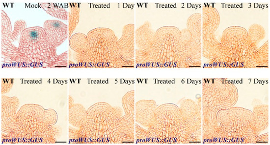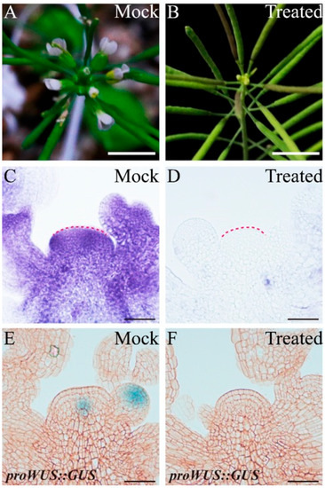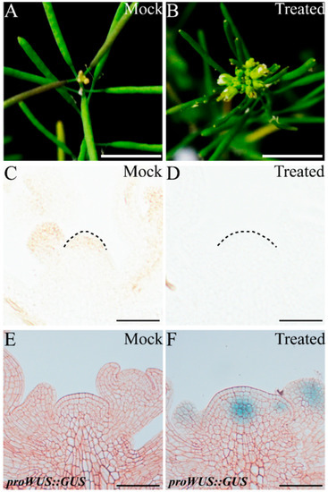 For ROS scavenger treatment in the WT and proWUS::GUS lines, primary shoot inflorescences at 1 WAB were immersed in a 20 mM DMTU (Sigma–Aldrich, Tokyo, Japan) solution containing 0.01% Silwet L-77 for 10 s each day, and primary shoot inflorescences at 2 WAB were immersed in a 5 mM KI (Sigma–Aldrich, Tokyo, Japan) solution containing 0.01% Silwet L-77 for 10 s each day. The treatment was maintained for one week. For the control group, double distilled water containing 0.01% Silwet L-77 was used. For each experiment, at least 5 individual inflorescences were treated.
